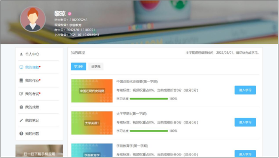 进入我的课程,可查看学习进度,点击“进入学习”→进入课程学习页面。