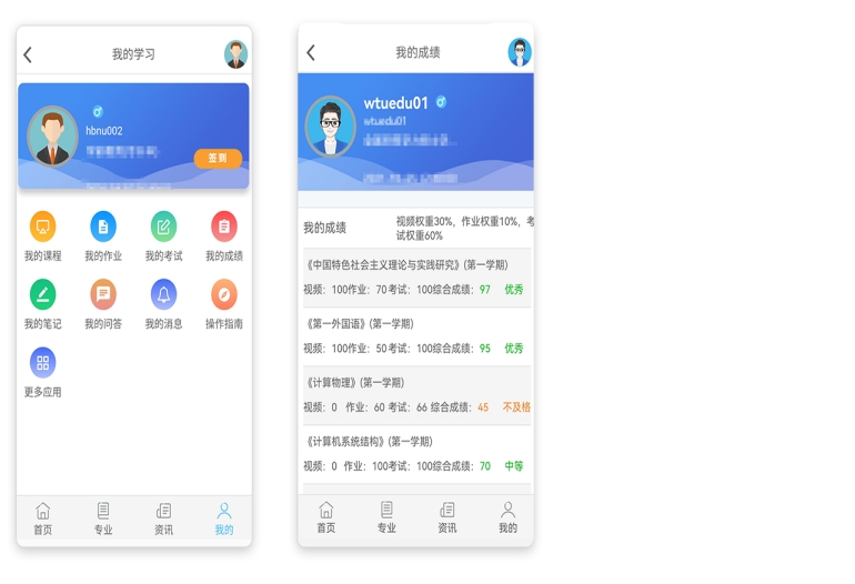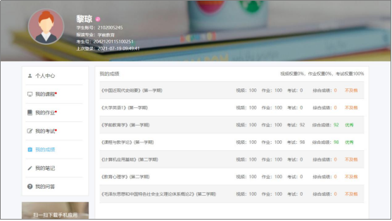学生在“qy球友会高等学历继续教育学习平台(良师)”平台进行学习和考试,课程总评成绩=期末考试成绩×50%+平时成绩×50%,课程总评成绩一般按百分制计算。部分课程的平时成绩如有直播课或实验实训,则计算方法为网课30%或40%、直播课10%、实验实训10%;若课程无直播课和实验实训,则网课成绩为50%。网课学习达到90%以上才能够参加考试。