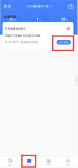手机APP端:在【学习】页面中,点击“进入课堂”,即可观看直播课堂。