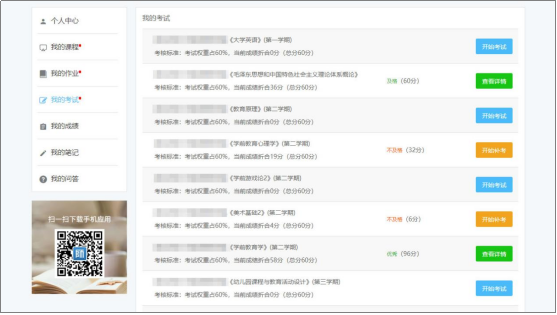 进入我的考试→可进行考试并查看试卷成绩,考试不及格可以补考。【如上图所示】